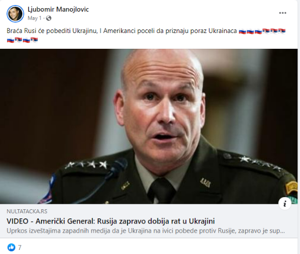 Tvrdnju portala Nulta tačka i objave na društvenim mrežama koje se odnose na navodnu izjavu generala Oružanih snaga SAD-a, da Rusija pobjeđuje u ratu protiv Ukrajine ocjenjujemo kao lažnu vijest.