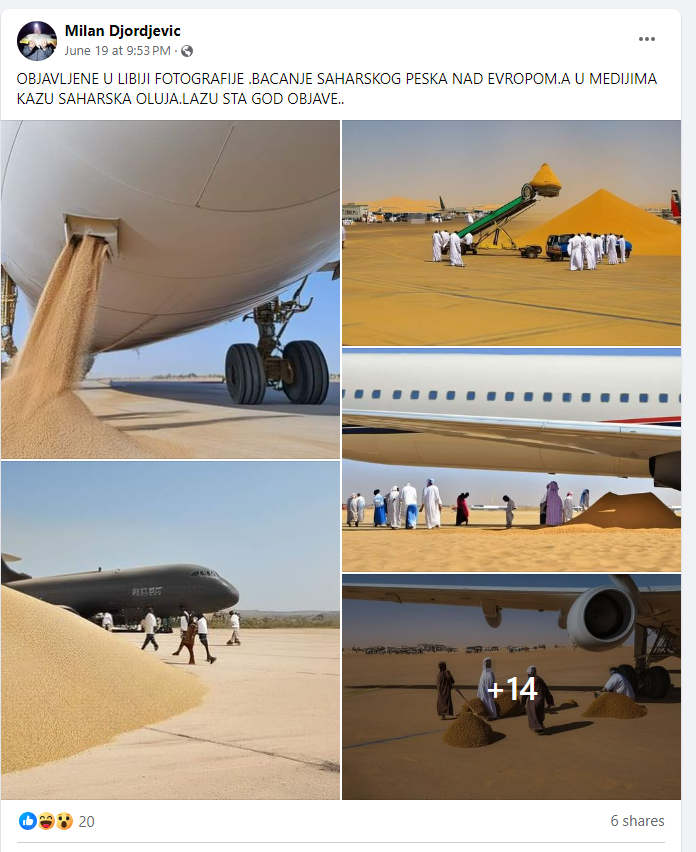 “Objavljene u Libiji fotografije. Bacanje saharskog peska nad Evropom. A u medijima kažu saharska oluja. Lažu šta god objave”, piše u tekstu objave koju smo pronašli na Fejsbuku, a koju prati više fotografija.
