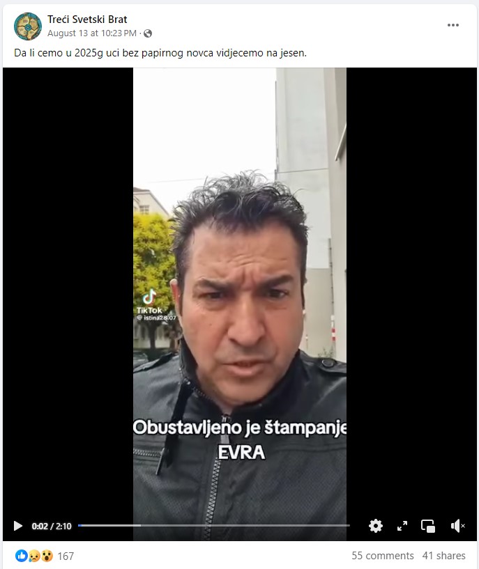 Na Tik Toku i Fejsbuku (1, 2) podijeljen je video u kojem narator tvrdi da je Evropska centralna banka (ECB) obustavila štampanje eura, i to navodno od 1. juna ove godine.