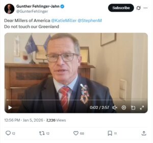 Citirana izjava je zaista autentična i potiče sa zvaničnog naloga Guntera Felingera na društvenoj mreži X (arhivirano), uz poruku koja je upućena američkom političkom savjetniku i zamjeniku šefa kabineta za politiku i bezbjednost domovine u Bijeloj kući Stefenu Milleru  i njegovoj supruzi Katie Miller, političkoj komentatorki da “ne diraju Grenland”.