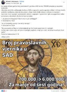 “U posljednje vrijeme, na internetu kruži mim koji tvrdi da je broj pravoslavnih hrišćana u Americi porastao sa 700.000 na šest miliona za samo četiri godine, od 2020. do 2024. Ovo je potpuna fikcija – ali ima prilično dugu istoriju.”