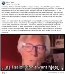 “Finansijska diktatura dolazi! Predsjednica Europske središnje banke, Christine Lagarde, ležerno pušta mačku iz vreće u prijenosu uživo. Nakon uvođenja digitalnog eura, gotovinsko plaćanje bit će moguće samo do 1.000 eura. Bezgotovinsko plaćanje automatski će se pratiti od iznosa od 300 eura. A ako se država članica EU ne slaže s plaćanjem, građaninu jednostavno neće biti dopušteno da je izvrši”, piše, između ostalog, u opisu objave.
