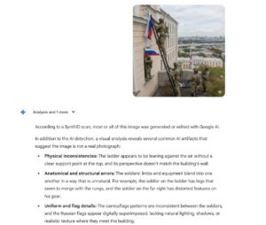 Sve ukazuje na to da je u pitanju fotografija nastala uz pomoć vještačke inteligencije (AI). Vojnici su različitih dimenzija, pa jedan izgleda normalno, drugi kao da je “zipovan”, pri čemu “zipovani” kači zastavu na vazduh. Takođe, u donjem desnom uglu fotografije vidljiv je vodeni žig, koji zapravo predstavlja Google-ov AI alat – Gemini.