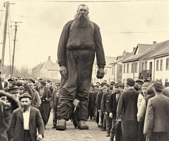 Na fotografiji je moguće vidjeti zaista džinovskog čovjeka, koji prolazi pored “običnih smrtnika” a koji su mu bukvalno – do koljena. Međutim, istorija ovu fotografiju ne poznaje, sa njom nijesu saglasne činjenice, kao ni profesori koji se bave AI-om.