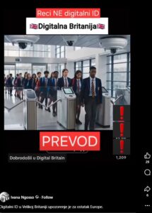 “Dobrodošli u digitalu Veliku Britaniju. Svako dijete mora skenirati svoje lice prije ulaska u školu. Prema novom Zakonu o digitalnoj usklađenosti, svi građani moraju provjeriti svoj digitalni identitet ili rizikovati gubitak svojjih privilegija”.