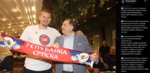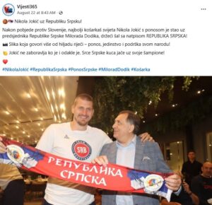 Nakon pobjede protiv Slovenije, najbolji košarkaš svijeta Nikola Jokić s ponosom je stao uz predsjednika Republike Srpske Milorada Dodika, držeći šal sa natpisom REPUBLIKA SRPSKA!