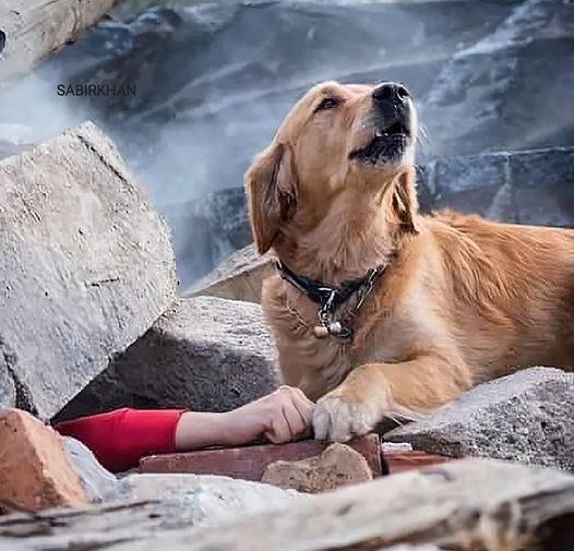 Brojne stranice i korisnici Fejsbuka podijelili su fotografiju psa koji leži na ruševinama, a pored njega se vidi ruka zarobljene osobe (1, 2, 3, 4).