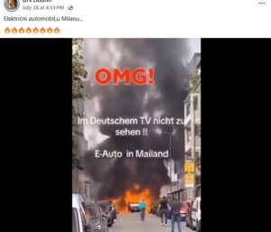 Jedna takva priča nam dolazi sa ulica Milana. Na Fejsbuku se pojavio video na kojem se može vidjeti vozilo u plamenu, a post prate navodi: (arhivirano: ovdje)