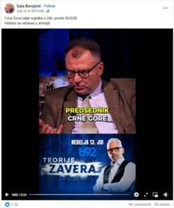 “Crna Gora šalje vojnike u Ukrajinu protiv Rusije!”, piše u opisu objave (arhivirano) kojom je na društvenim mrežama najavljena emisija.