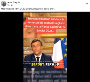 Predsjednik, Emanuel Makron, suočava se sa padom povjerenja, a sigurno mu na ruku ne bi išlo da zatvara crkve. To mu se spočitava na društvenim mrežama: da je rekao da zatvara crkve od početka naredne godine, koja je pred nama. U jednom videu na francuskom, Makron navodno najavljuje zatvaranja, a post prate navodi: (arhivirano: ovdje):