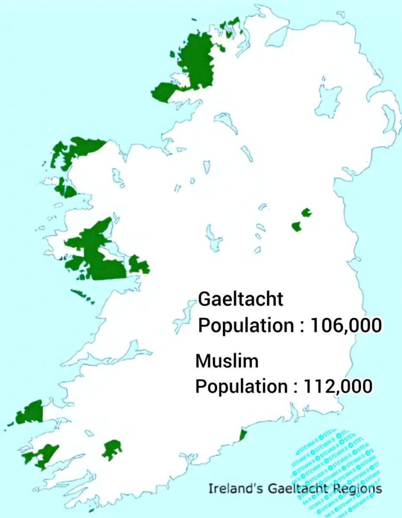 “U Irskoj ima više muslimana nego što je ukupno stanovništvo irskoga govornog područja Gelteht”, piše u opisu vizuala koji se dijeli na društvenim mrežama (arhivirano).