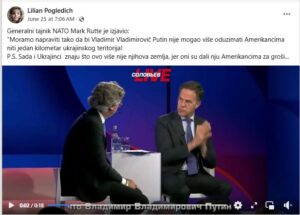 “Generalni tajnik NATO Mark Rutte je izjavio: “Moramo napraviti tako da bi Vladimir Vladimirovič Putin nije mogao više oduzimati Amerikancima niti jedan kilometar ukrajinskog teritorija!