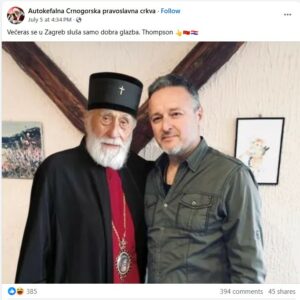 Među prisutnima je, kako se sugeriše na Fejsbuk stranici “Autokefalna Crnogorska pravoslavna crkva” bio Mitropolit Crnogorske pravoslavne crkve (CPC), Mihailo Dedeić koji se navodno fotografisao sa Tompsonom.