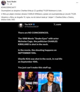 Ubojstvo u filmu se događa 10. rujna, na isti datum kada je “ubijen” i Charliea Kirka u Oremu, država Utah, SAD.