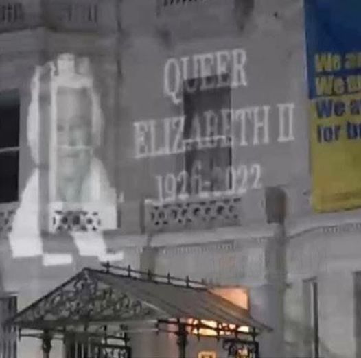Internetom kruži fotografija na kojoj se nazire zgrada ukrajinske ambasade u Londonu, a na kojoj je navodno preko projektora prikazana kraljičina fotografija i ispis “Queer Elizabeth II 1926-2022″.