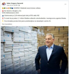 “Viktor Orban je objavio konačne rezultate konsultativne ankete Voks2025 o pristupanju Ukrajine Evropskoj uniji uoči samita EU u četvrtak. Premijer je rekao da je ukupno glasalo 2 miliona 278 hiljada ljudi, od kojih je 2 miliona 168 hiljada, odnosno 95 procenata onih koji su glasali, bilo protiv članstva Ukrajine u EU, dok je preostalih 5 procenata glasalo za pristupanje Ukrajine”, prenio je mađarski medij Telex.hu (arhivirano).