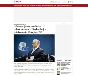 Krajem juna u pojedinim domaćim i regionalnim medijima poput portala: Borba.me (arhivirano), In4s (arhivirano), Tanjug.rs (arhivirano), Politika.rs (arhivirano) Sputnik Srbija (arhivirano), Informer (arhivirano), Euronews.rs (arhivirano), Srna.rs (arhivirano), Dnevnik.rs (arhivirano), RTRS (arhivirano), Argumenti (arhivirano), Banja Luka.net (arhivirano), Okvir.net (arhivirano), Vesti online.com (arhivirano), Slobodan pečat.mk (arhivirano) odjeknula je informacija da je Mađarska sprovela referendum na kojem se stanovništvo dominantno negativno izrazilo o ulasku Ukrajine u EU.