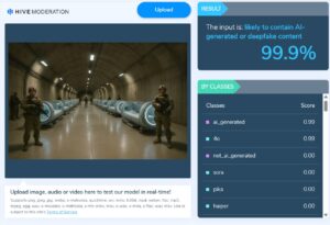 A fotografija tih kapsula koje su navodno stigle u podzemnu vojnu bazu, prema rezultatima alata Hive Moderation koji detektuje sadržaje kreirane vještačkom inteligencijom, jasno je da je fotografija nastala uz pomoć AI tehnologije.