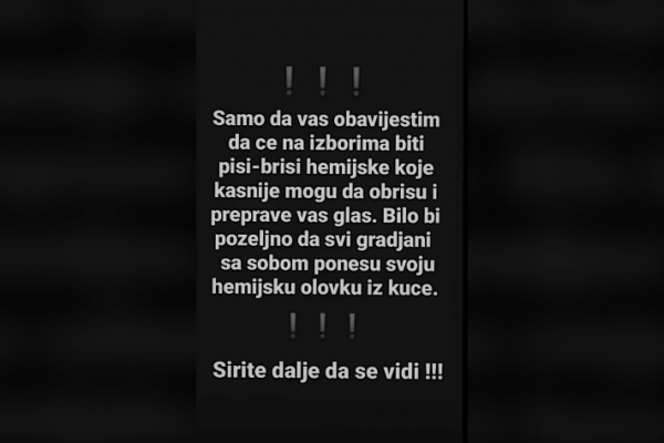 Društvenim mrežama uoči parlamentarnih izbora koji su održani 30. avgusta kružile su informacije o postojanju „piši-briši“ hemijskih olovaka koje se navodno planiraju koristiti na biračkim mjestima na dan izbora.