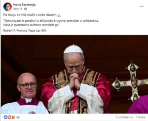 “Komunizam je prodro i u kršćanske krugove, prerušen u solidarnost. Naša je pastoralna dužnost razotkriti ga. – Robert F. Prevost, Papa Lav XIV”, piše u objavi.