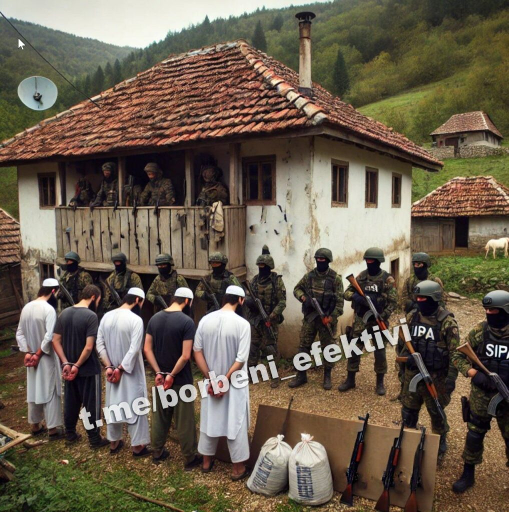 Jedna fotografija generisana uz pomoć AI tehnologija postala je viralna na društvenim mrežama. Na njoj se vidi trošna kuća na selu, navodno pripadnici bosanskohercegovačke Državne agencije za istrage i zaštitu SIPA pod punim naoružanjem, a naspram njih ljudi sa lisicama na rukama, koji bi valjda trebalo da budu islamski fundamentalisti, teroristi, šta li već. Fotografiju prate navodi: (1, 2, 3, 4, 5, 6, 7) (arhivirano: 1, 2)