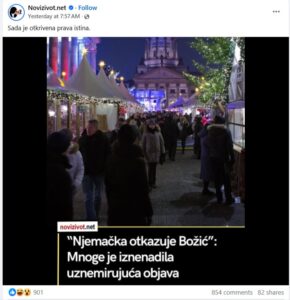 Na Fejsbuk stranici portala Novi život.net (arhivirano) pojavila se objava u kojoj piše da “Njemačka otkazuje Božić”, odnosno da se otkazuju božićni marketi.