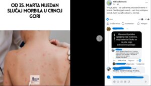 Objavu čini i printscreen fotografija na kojoj je ispisan naslov portala Berane Online “Od 25. marta nijedan slučaj morbila u Crnoj Gori”, a tekst je izvorno objavljen na portalu Dan (arhivirano).