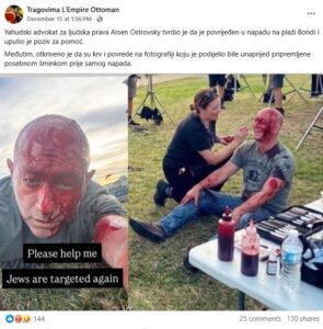Yahudski advokat za ljudska prava Arsen Ostrovsky tvrdio je da je povrijeđen u napadu na plaži Bondi i uputio je poziv za pomoć. Međutim, otkriveno je da su krv i povrede na fotografiji koju je podijelio bile unaprijed pripremljene posebnom šminkom prije samog napada.
