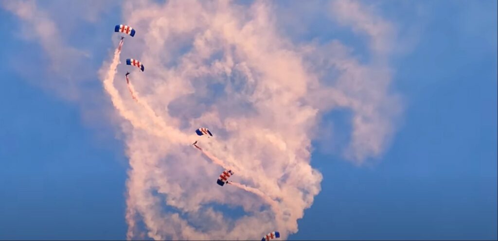 Cilj aeromitinga je promocija avijacije i demonstracija tehnoloških inovacija i vještina, a jedan takav performans upravo su izveli padobranci Kraljevskog vazduhoplovstva Falcons koji je i zabilježen na snimku podijeljenom na Fejsbuku.
