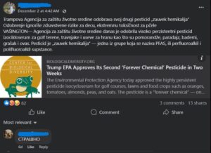 Nedavna objava (arhivirano) na Facebook-u, koju je prenijela Slađana Volkov, donosi vijest da je Agencija za zaštitu životne sredine Sjedinjenih Američkih Država, pod administracijom Donalda Trampa, odobrila novi pesticid pod nazivom isocycloseram, za koji se tvrdi da spada u tzv. „zauvijek hemikalije“ (PFAS), i da predstavlja ozbiljnu prijetnju po zdravlje djece, oprašivače poput pčela, i životnu sredinu u cjelini. Tvrdnja glasi: