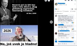 „Severni pol će biti bez leda u leto 2013, zbog globalnog zagrevanja izazvanog čovekom“, dok ispod tog citata vidimo smrznutu glavu nepoznatog čovjeka kao dokaz da je još uvijek hladno i da klimatske promjene ne postoje.