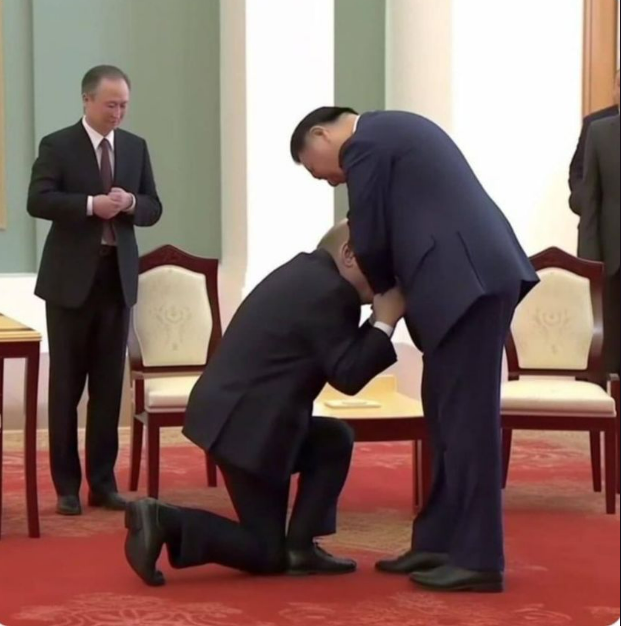 Društvenim mrežama proširila se fotografija na kojoj se navodno vidi kako Putin kleči i ljubi ruku Siju. Neki korisnici Fejsbuka to su shvatili ovako: