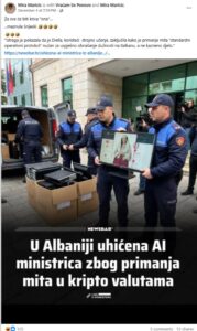 Newsbar.hr objavio je fiktivnu priču da je albanska AI ministarka Diella „uhapšena“ jer je primila mito u bitkoinima i preusmjeravala 10–15% ugovora na nepoznate račune.