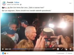 Više njih je podijelilo video koji prikazuje prepirku između aktuelnog izraelskog ministra nacionalne sigurnosti, Itamara Ben Gvira i izraelskog političara Omera Bar Leva. (1, 2, 3, 4, 5, 6, 7) (arhivirano)