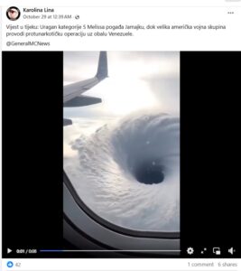 Dakle, snimci uragana Melisa iz vazduha zaista postoje, ali to nije video koji se dijeli na Fejsbuku, koji je zapravo nastao kao djelo AI tehnologije.
