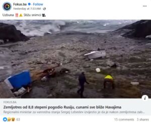 “Zemljotres od 8,8 stepeni pogodio Rusiju, cunami sve bliže Havajima”, naslov je teksta portala Fokus.ba.