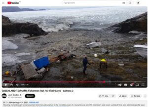 “Šokantan trenutak zabilježen kamerom kada su ribari bili iznenađeni nevjerovatnom snagom cunami talasa koji je pogodio zapadnu obalu Grenlanda. Srećom, sva trojica uspjela su da pobjegnu na vrijeme. Uveče 17. juna 2017. godine (oko 21:40 po lokalnom vremenu), došlo je do ogromnog klizišta (dimenzija 300 × 1.100 metara) na južnoj padini poluostrva Umiammakku Nunaat.