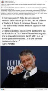 “Ministar kulture i fotografije jučer je od gradonačelnika Rima zatražio, da se promijeni ime Ulice Tito, tvrdeći da bivši jugoslavenski diktator to ne zaslužuje. Postoji samo jedan mali, sitni detalj. Ulica je nazvana po Titu Cezaru Vespazijanu Augustu, koji je bio rimski car od 79. do 81. godine”, piše, između ostalog, u objavama. (1, 2) (arhivirano ovdje i ovdje).
