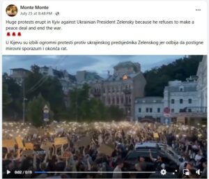 Na Fejsbuku je podijeljen video (arhivirano), uz tvrdnju da prikazuje ukrajinski narod koji je navodno izašao na ulice zato što je predsjednik Ukrajine, Volodimir Zelenski odbio da potpiše mirovni sporazum sa Rusijom.