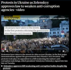 Zelenski je potpisao (arhivirano) 22. jula sporni zakon kojim se značajno mijenja status i nezavisnost ključnih antikorupcijskih institucija u Ukrajini – Nacionalnog biroa za borbu protiv korupcije (NABU) i Specijalizovanog tužilaštva za borbu protiv korupcije (SAPO).