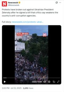 “Demonstranti su izašli na ulice u gradovima širom Ukrajine, u prvim velikim protestima protiv vlade od ruske invazije 2022. godine. Protesti su održani kao odgovor na zakon koji slabi nacionalne antikorupcijske nadzorne institucije, a koji je predsjednik Volodimir Zelenski potpisao u utorak uveče”, piše u opisu videa.