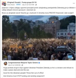 I na osnovu opisa te objave, jasno je da protesti u Ukrajini nisu organizovani zbog toga što Zelenski nije potpisao mirovni sporazum sa Rusijom.
