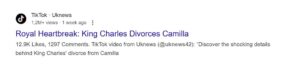 Profil sa kojeg je potekao sporni snimak, “uknews42” na TikToku, trenutno nije dostupan. Dostupni su samo neki naslovi koji su, očigledno, dijeljeni na tom kanalu. Jedan od njih glasi da su se kralj Čarls i kraljica Kamila razveli.