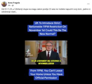Sličan narativ kruži društvenim mrežama, na našem govornom području, ali i šire. U pitanju je video na kojem se može vidjeti britanski premijer, Kir Starmer, koji navodno proglašava uvođenje policijskog časa, a sam narativ glasi: (arhivirano: ovdje).
