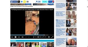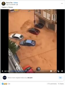 Zatim, naredni kadar koji prikazuje nabujalu vodu u trenutku kada odnosi auta snimljen je tokom poplava koje su pogodile velike djelove Španije krajem oktobra 2024. godine, pri čemu je Valensija bila najpogođenija.