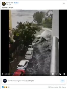 Zatim, naredni kadar koji prikazuje nabujalu vodu u trenutku kada odnosi auta snimljen je tokom poplava koje su pogodile velike djelove Španije krajem oktobra 2024. godine, pri čemu je Valensija bila najpogođenija.