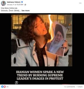 Ova žena riskira sve. Slobodu. Život. Obitelj.  U Iranu, gdje je režim jači od zakona, ona javno pali sliku diktatora. Bez zaštite. Bez privilegija. Bez zapadnih medija koji će je sutra braniti.  To je prava hrabrost.  To je stvarna borba za prava žena. A gdje su sada glasne feminiskinje, Dalije, Kate, Benčićke , B.A.B.E.?  Gdje su ljevičari koji inače viču o “opresiji”? Šute.!!!!! Jer ova žena ne odgovara njihovom narativu. Nema performansa. Nema sigurnog aktivizma. Samo čista hrabrost protiv brutalnog režima. Poštovanje ovoj ženi. Sram onima koji šute.!!!