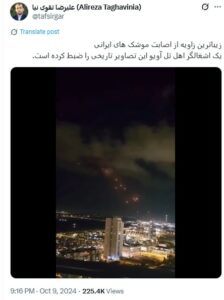 Podijeljen je na društvenoj mreži Iks, a prevod opisa objave sa persijskog jezika upućuje da je riječ o napadu Irana na Tel Aviv.