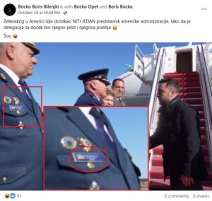 Objavljeni skromni snimci pokazuju da, pored Jermaka, šefa kijevskog režima dočekuju i ljudi u, kako se čini, pilotskim uniformama, kao i američki general. Prema televizijskom kanalu, Zelenski je možda naterao posadu sopstvenog aviona da ga pozdravi na američkom tlu.”